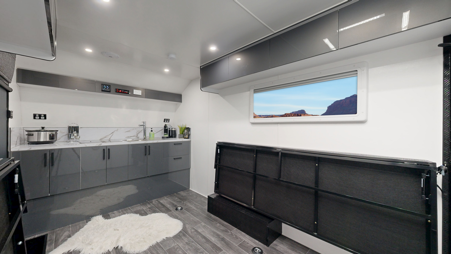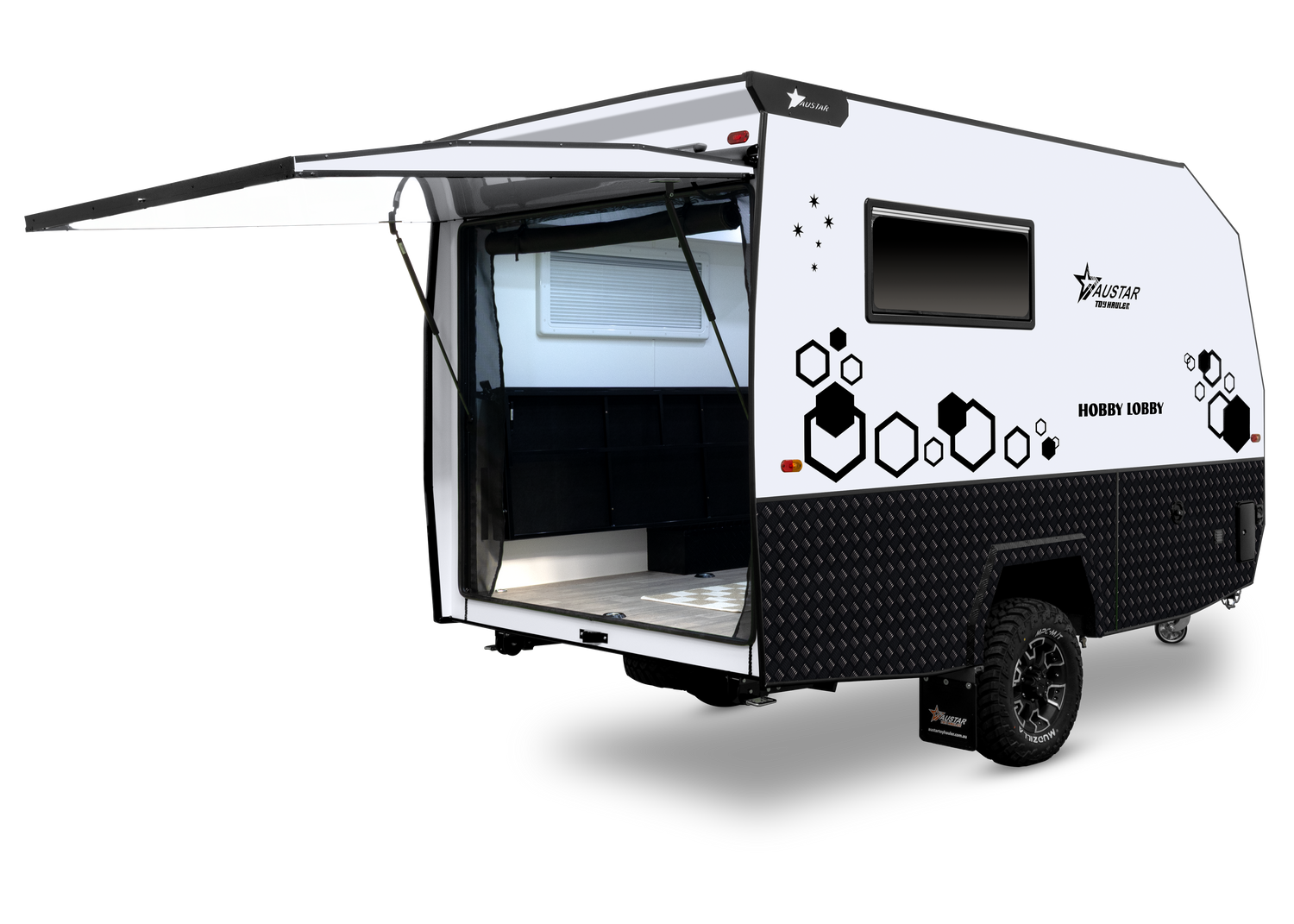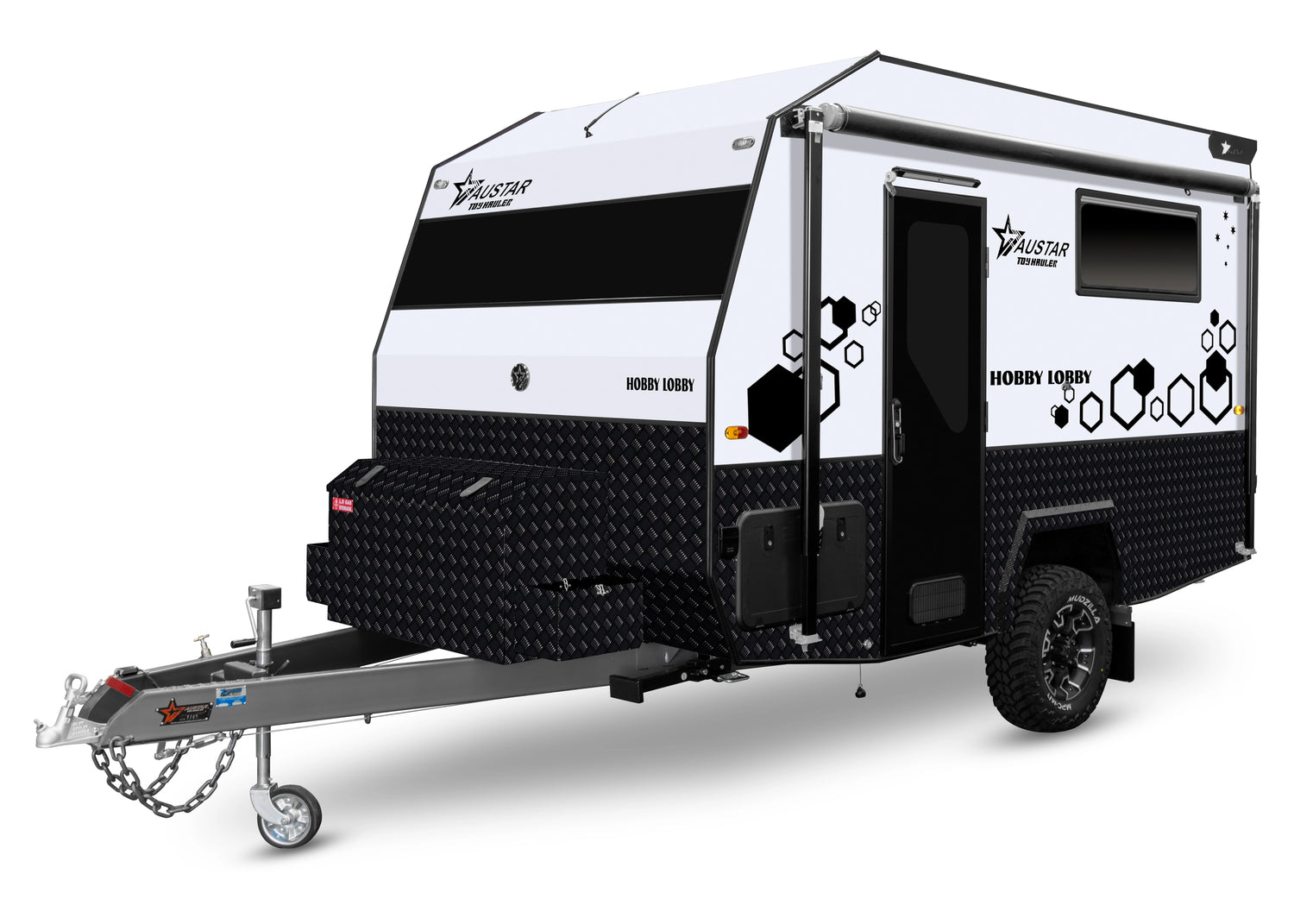 Built with durability in mind some key features include an internal kitchenette, storage cupboards, ample space for dirt bikes, kayaks, and more, making it perfect for weekend getaways or extended trips. Whether you’re heading to the mountains, the beach, or your favourite off-road trails, the 12FT Hobby Lobby Rider Toy Hauler offers the convenience and reliability you need for all your outdoor adventures.