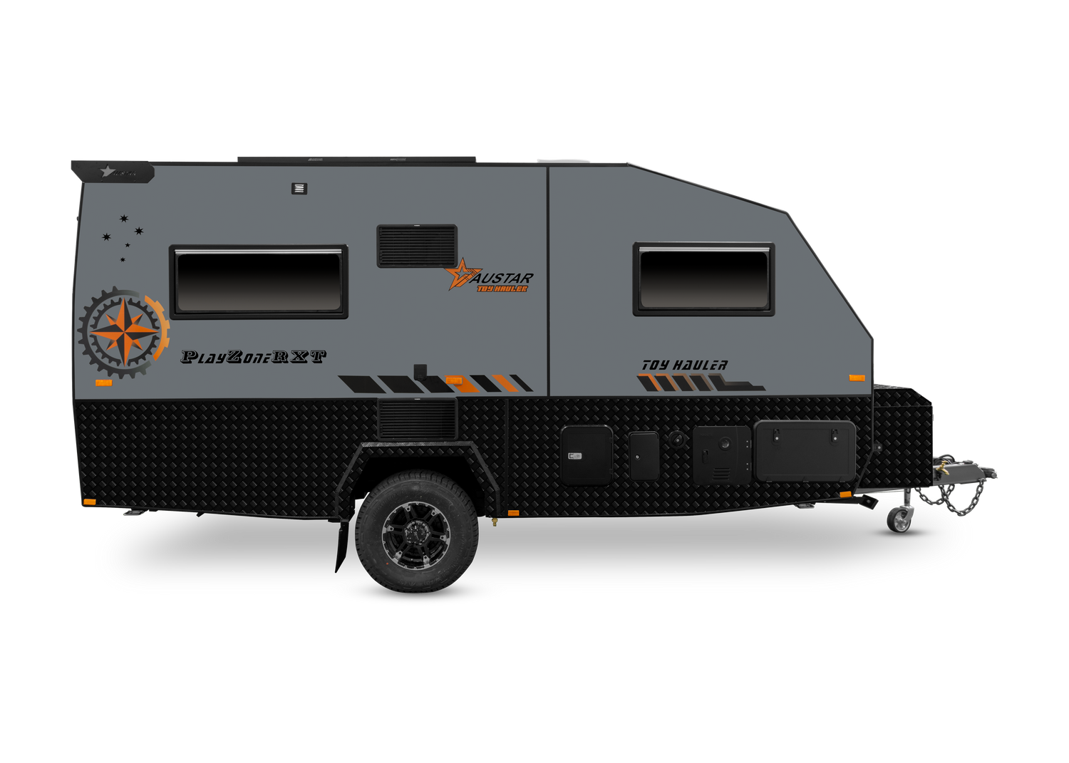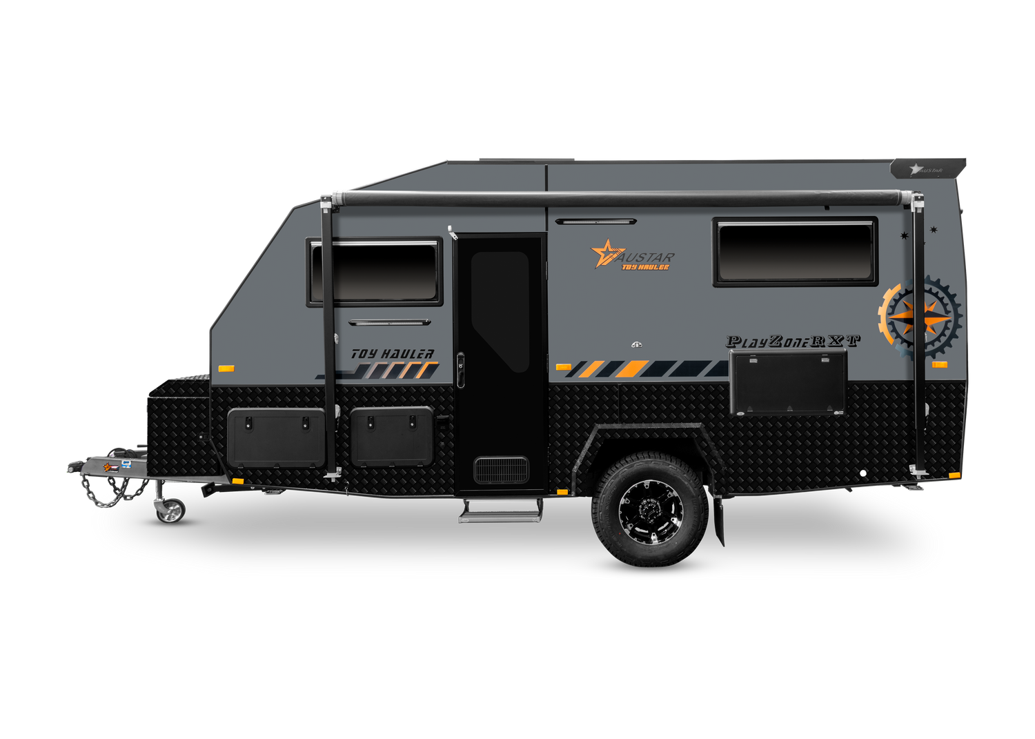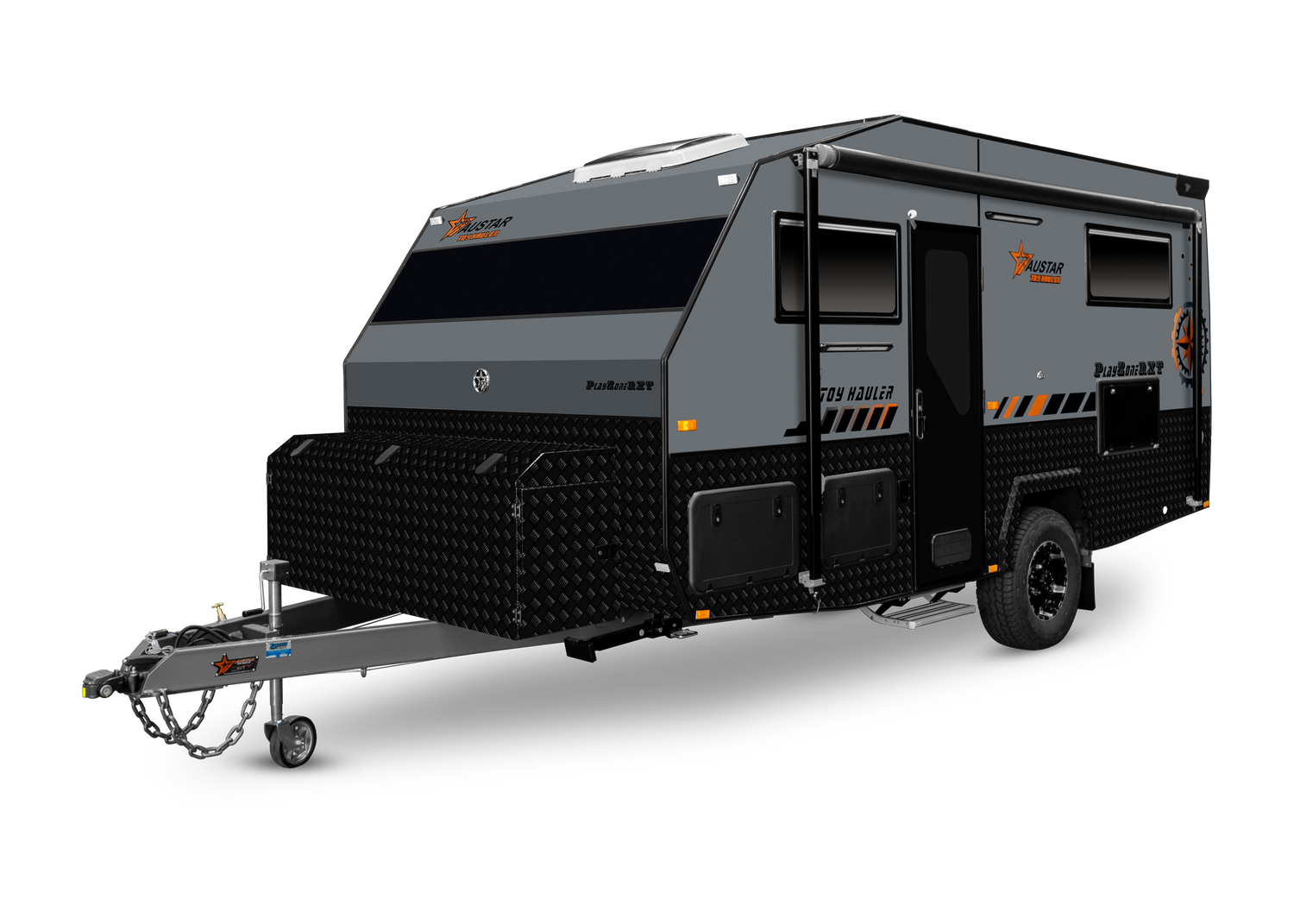 Austar Toolbox with 2 Jerry Can holders Rear Sky Window Bathroom Roof Hatch with Inbuilt Fan and LED Light 13ft Awning (Door Side) Tunnel Boot Storage Space 2 Rear Work lights Lift Up Tailgate Door (Opening with Gas Struts) External 240V Inlet External 240V Outlet 12V Cigarette socket point Light Above Main Door Light Above External Kitchen Hatch 2 Rear work lights TV Antenna Triple Lock Entry Door with Security Mesh Fly Screen
