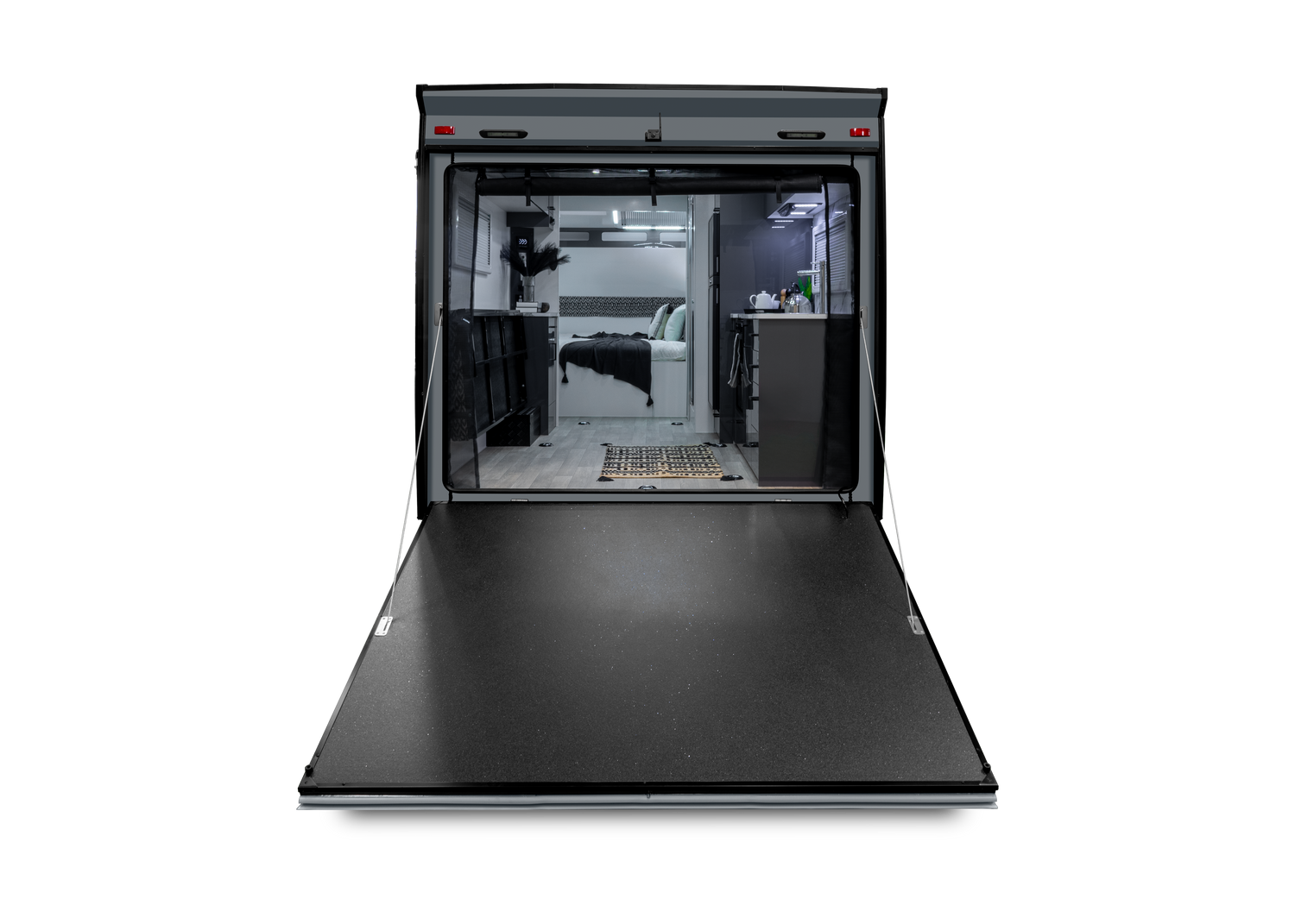 Galvanize Chassis Off Road Pack (Independent suspension and DO35 Coupling) Single Axle Extended A Frame 12” Electric Brakes 16” Alloy wheels Hand Brake 7 Pin Flat Tow Plug 50AMP Grey Anderson Plug Jockey Wheel Safety Chains Break Away Switch Spare Tyre 4 Drop Down Stabiliser Legs Robust Aluminium Welded Frame Fully Insulated Composite Panels all Around Black Checker Plate on Sides