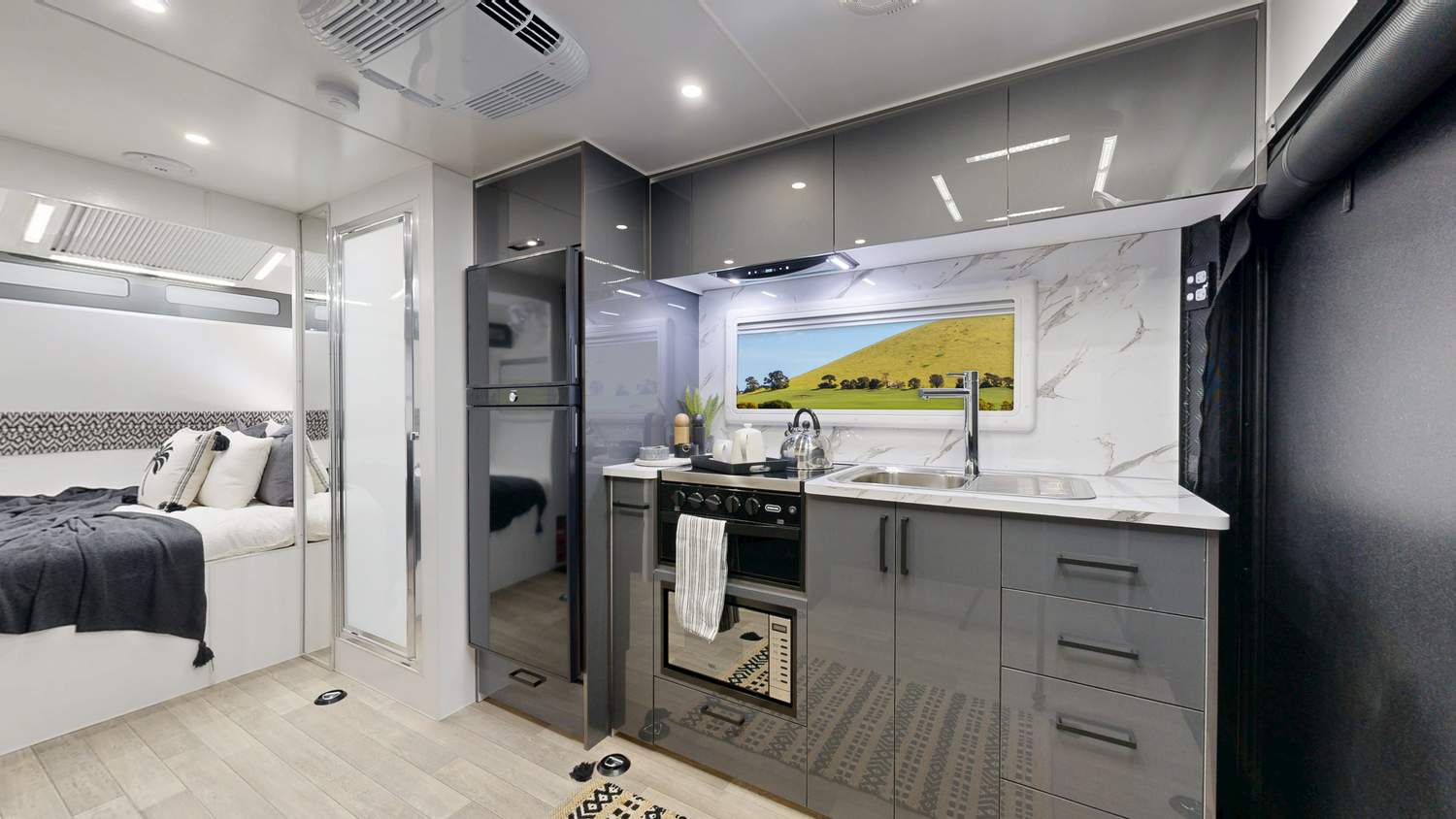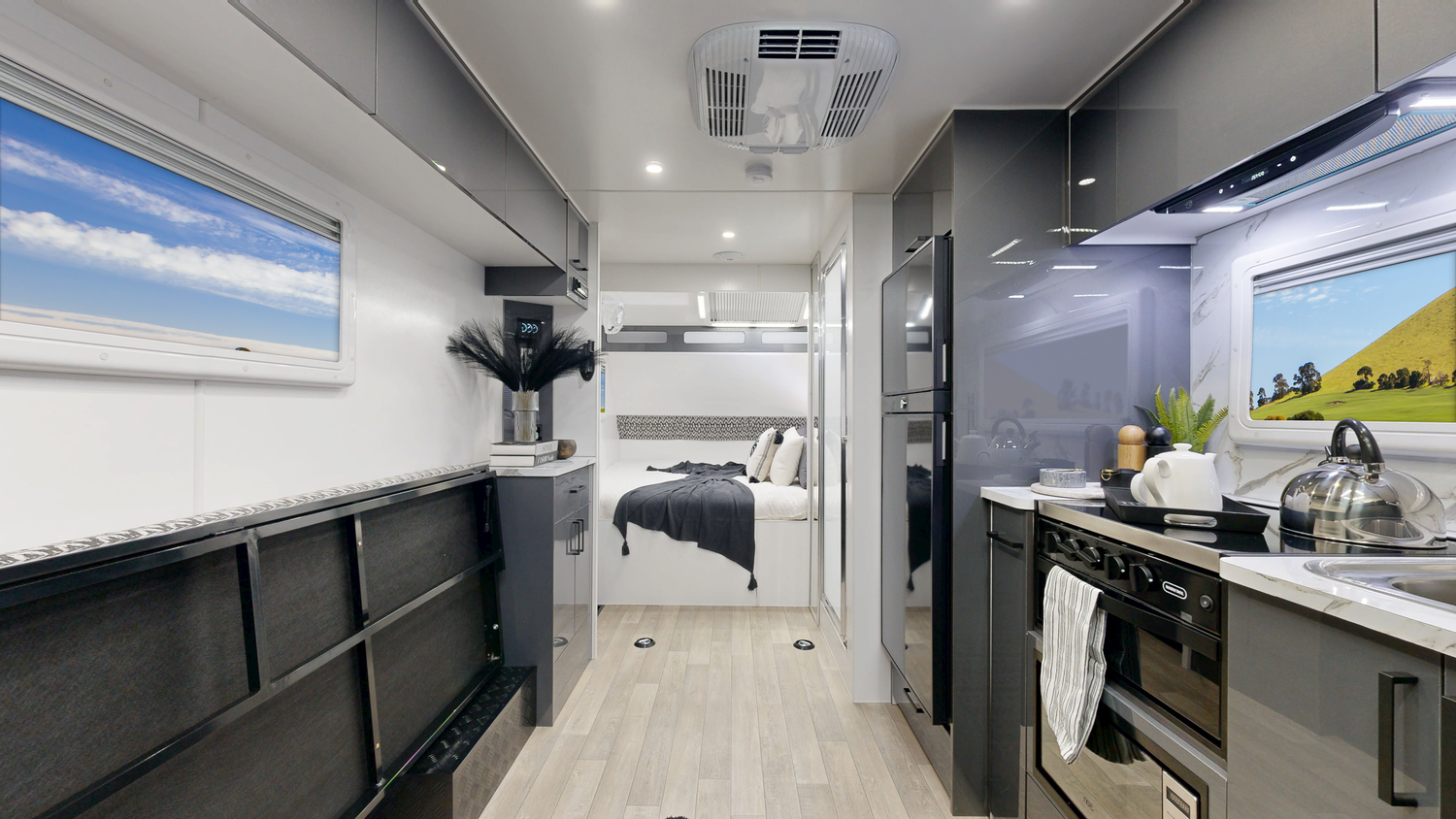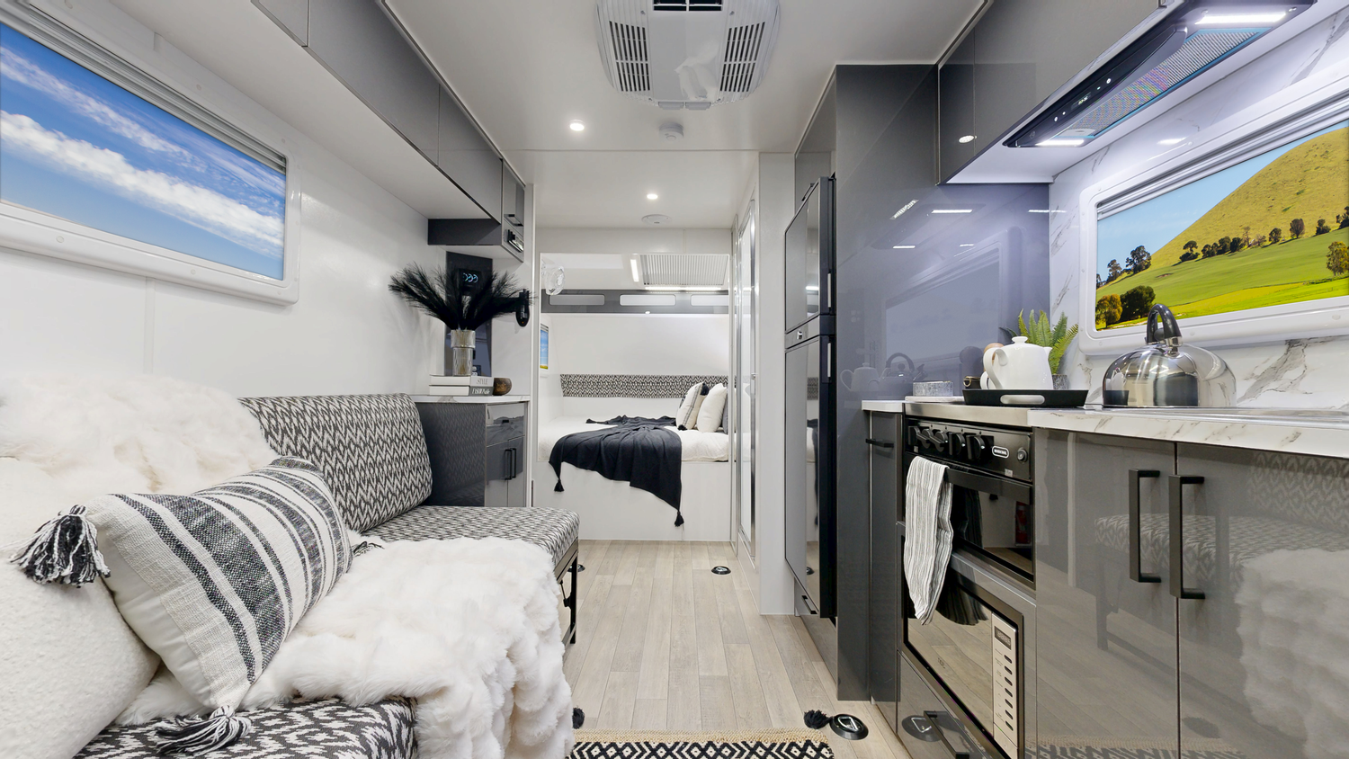 Fire Extinguisher Storage (Cupboards & Draws) Laminate Splashback & Bench tops Queen Bed Spring Mattress Bed Head with Cupboards Full length Bedroom Pocket Over Head Pocket Above Main Door Toilet & Shower Combo 1 Bunk/ Lounge (1900mm x750mm) with Back Rests 2 Speakers 24” TV (Includes Tv Arm & Bracket) 2 Reading Lights with USB in bedroom 12V USB & USB-C Points (X3) 240V Power Points (x3) 12V LED Down Lights Stereo (Radio, USB & Bluetooth) 7 Tie Down Points Premium Quality Vinyl Flooring
