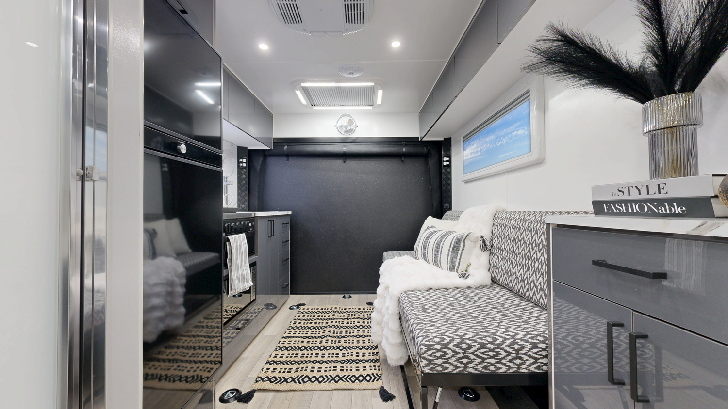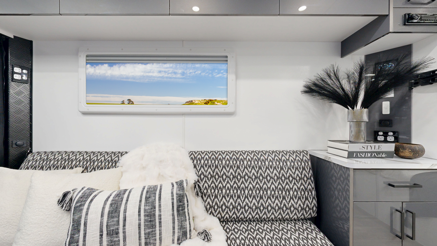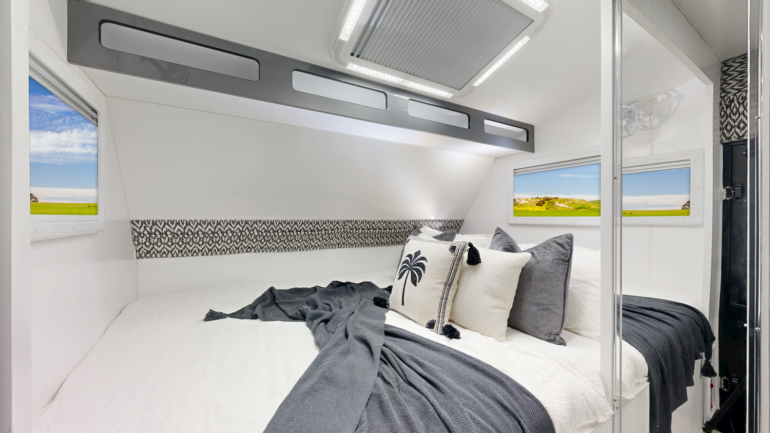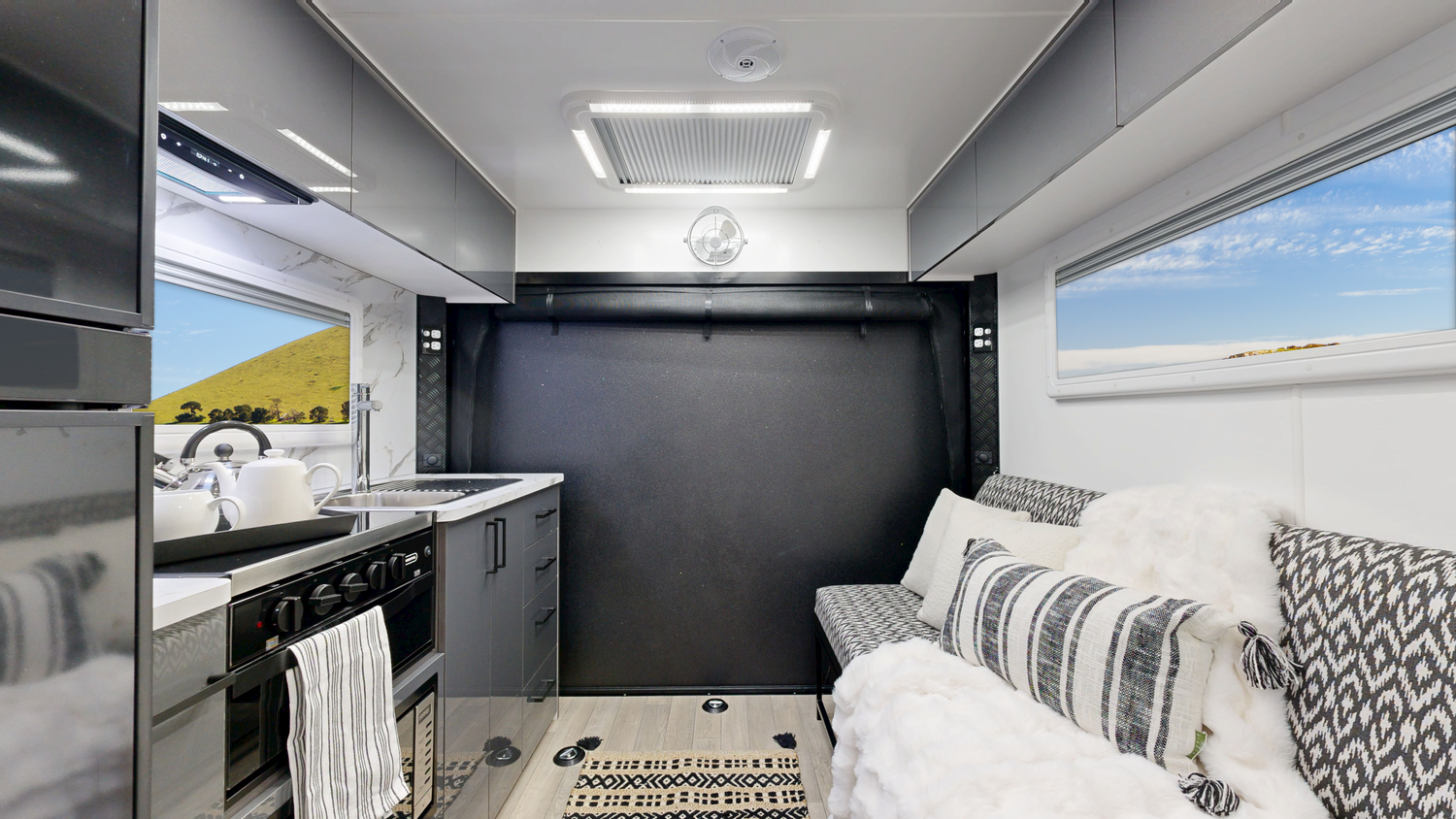 Fire Extinguisher Storage (Cupboards & Draws) Laminate Splashback & Bench tops Queen Bed Spring Mattress Bed Head with Cupboards Full length Bedroom Pocket Over Head Pocket Above Main Door Toilet & Shower Combo 1 Bunk/ Lounge (1900mm x750mm) with Back Rests 2 Speakers 24” TV (Includes Tv Arm & Bracket) 2 Reading Lights with USB in bedroom 12V USB & USB-C Points (X3) 240V Power Points (x3) 12V LED Down Lights Stereo (Radio, USB & Bluetooth) 7 Tie Down Points Premium Quality Vinyl Flooring