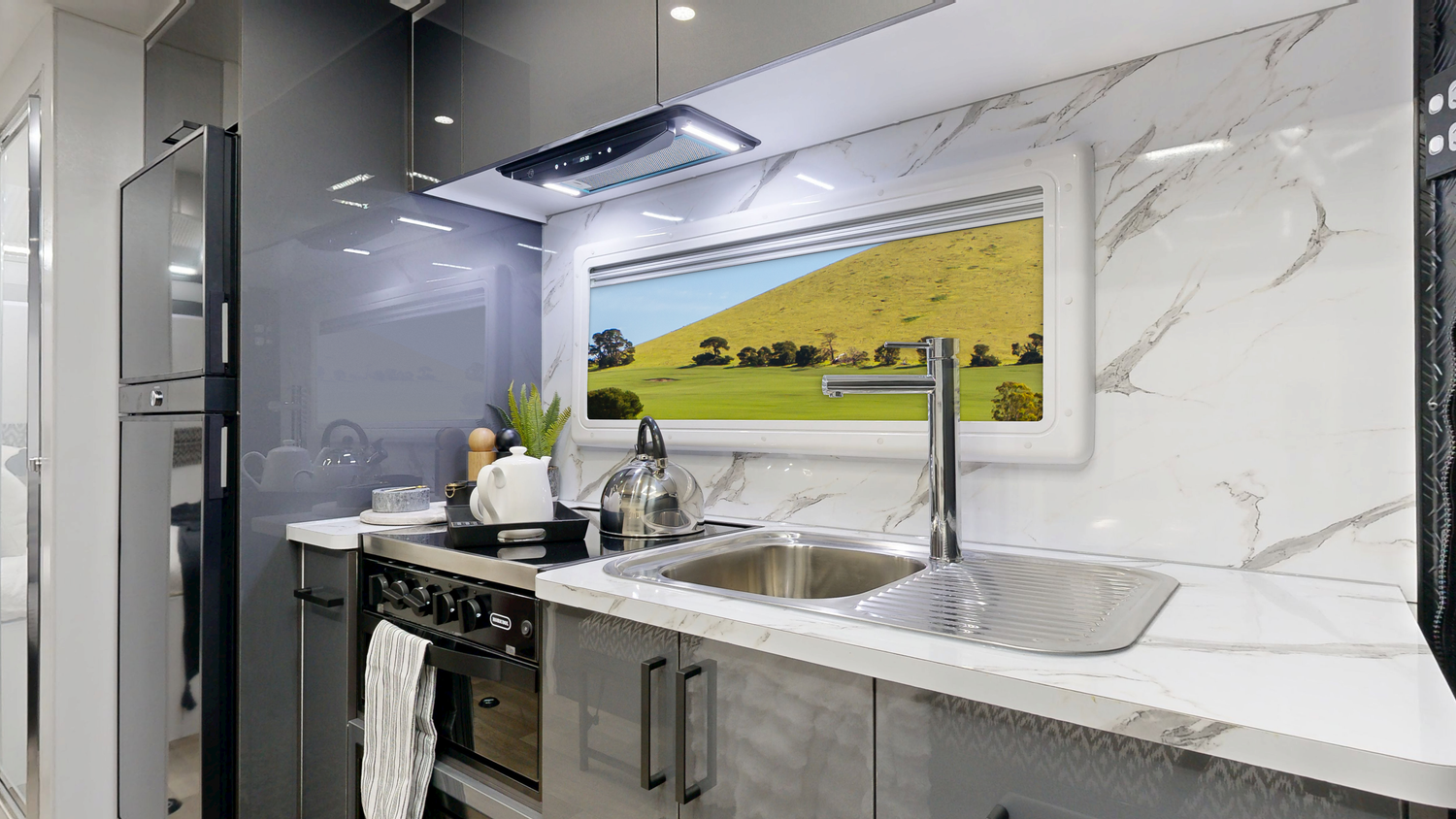 Mini Grill & 4 Burner Cooktop 12v Rangehood Microwave 240w 140L Compressor Fridge (2-way Fridge 12v and 240v)